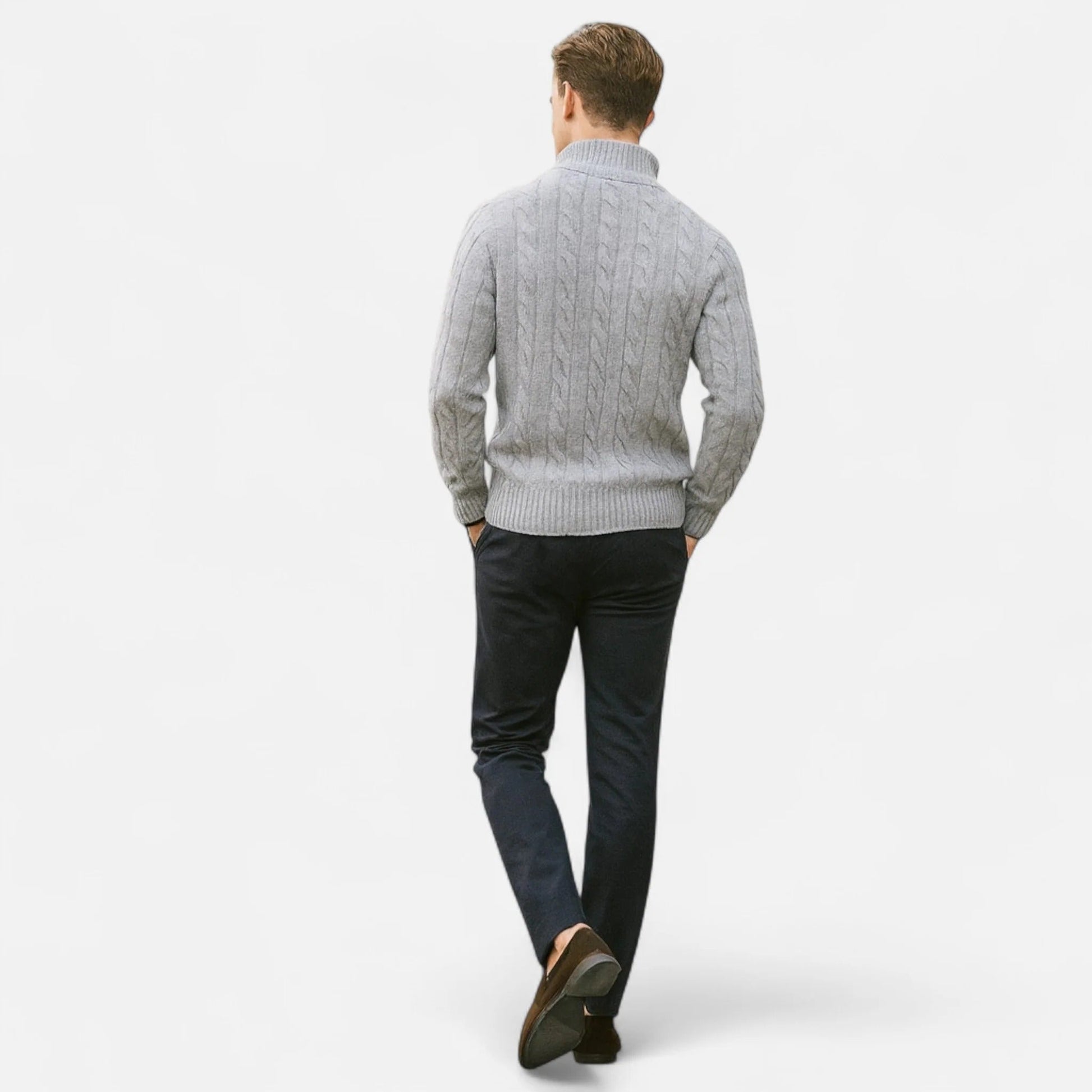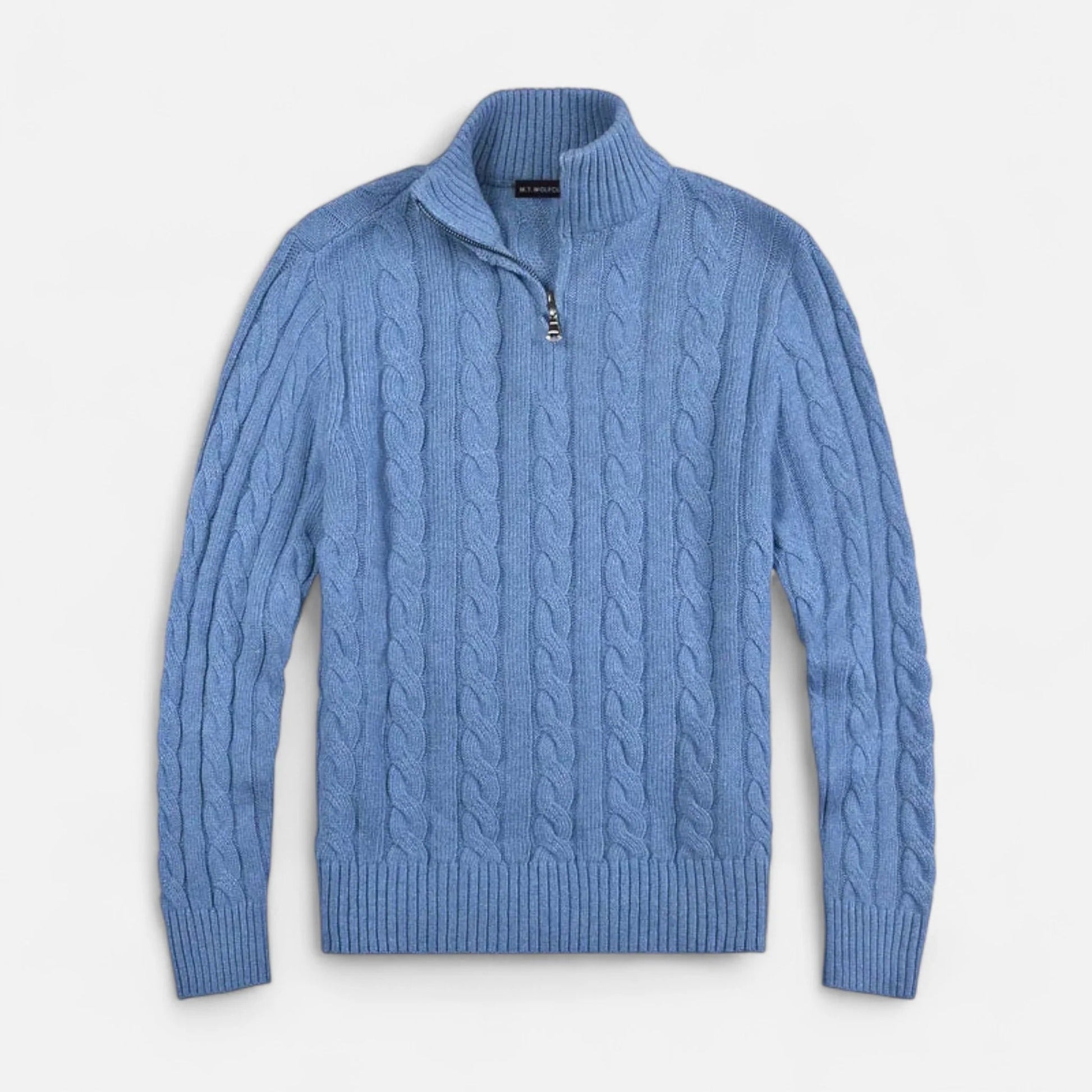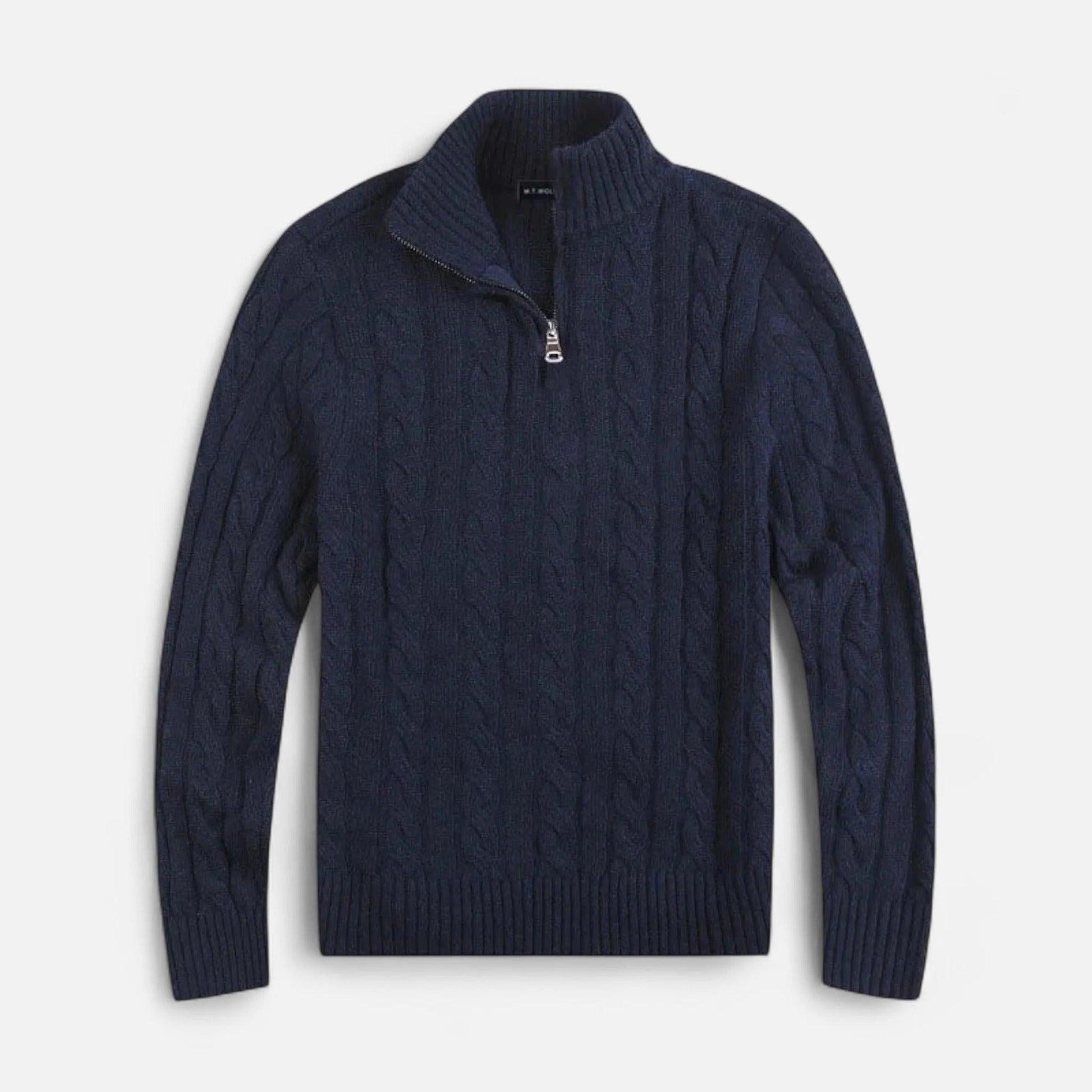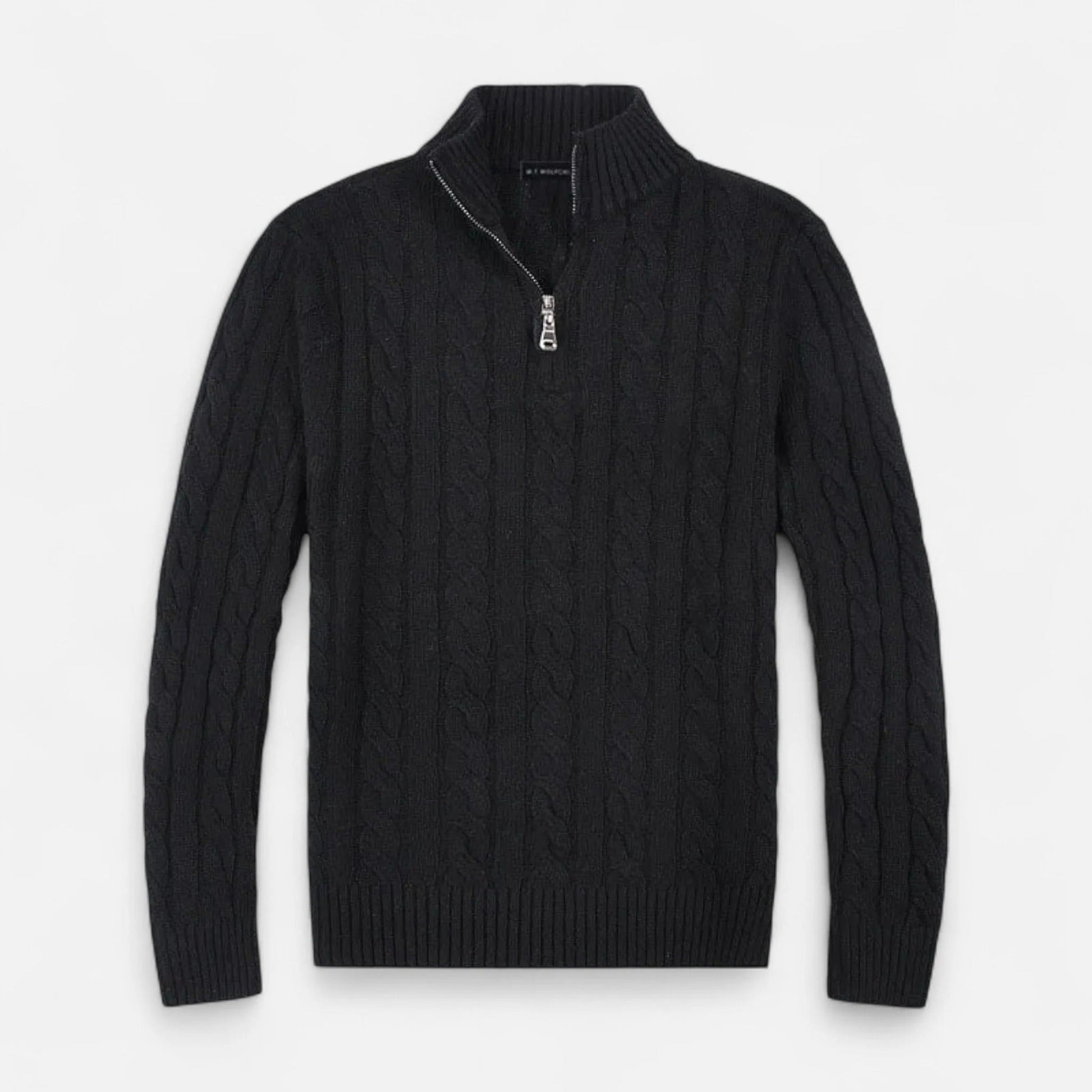 This men's cable knit quarter-zip jumper combines a classic design with modern comfort. Featuring a textured cable knit pattern and a practical quarter-zip neckline, it offers a versatile look suitable for casual and semi-formal outfits. The ribbed cuffs and hem ensure a secure fit, while the soft knit fabric provides everyday comfort.