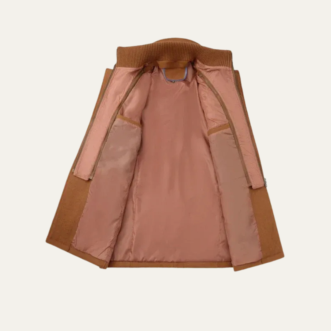 The Men’s Wool Blend Topcoat brings a polished military inspired look with thoughtful detailing. Its high standing collar adds a strong clean shape while the shoulder epaulets enhance the structured silhouette. Decorative button accents on the cuffs and pockets highlight the classic design and give the coat a distinctive refined finish. With a mid thigh length that balances warmth and versatility this coat pairs easily with smart or casual outfits making it a dependable choice for cool season wear.